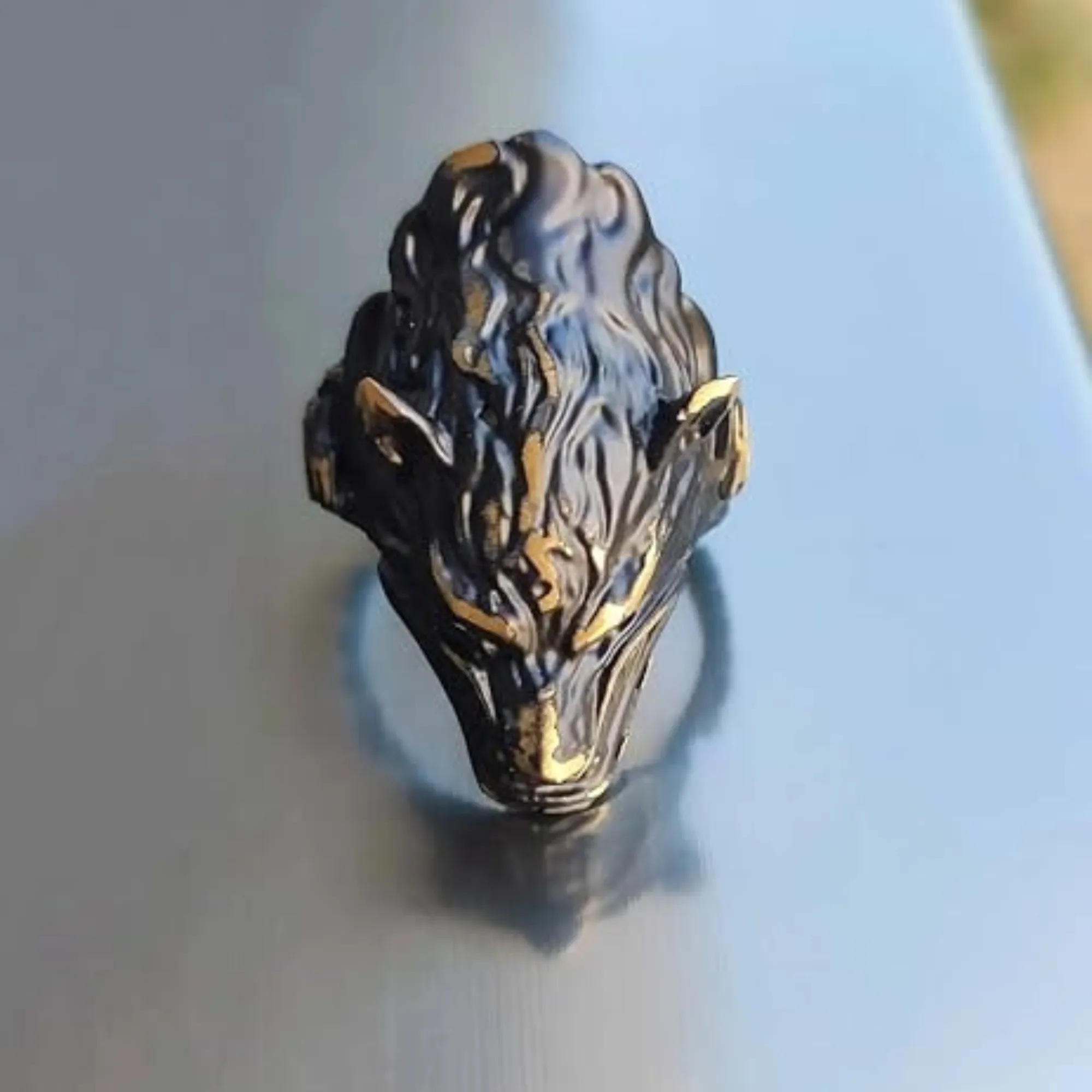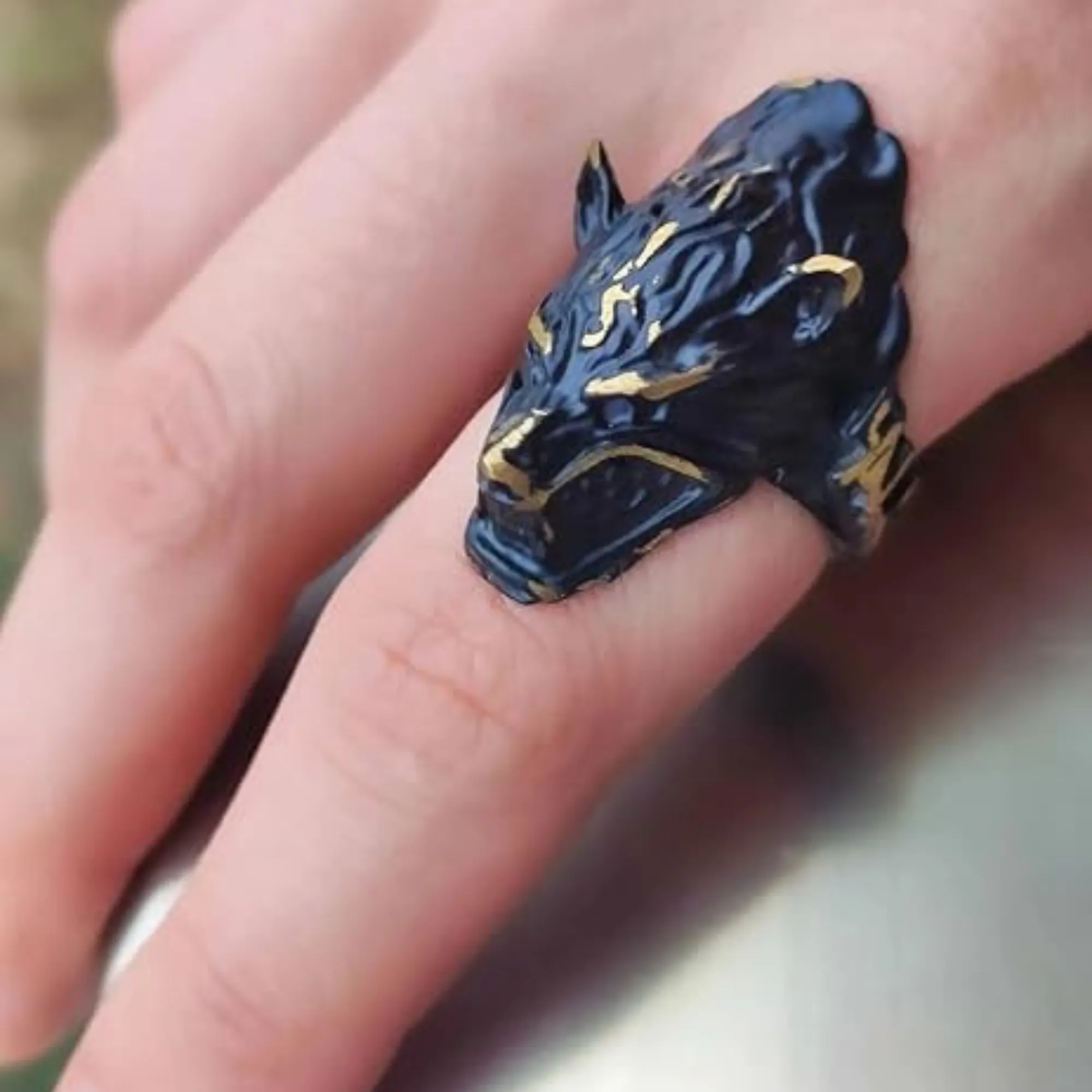 Its bold structure creates a strong visual presence on the hand.